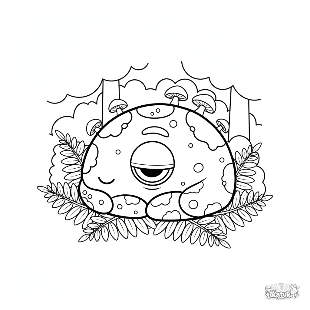 Toddler coloring page: a friendly mossy rock monster napping in a fern grove. Simple, large shapes with wide margins for easy coloring by kids ages 2-3.
