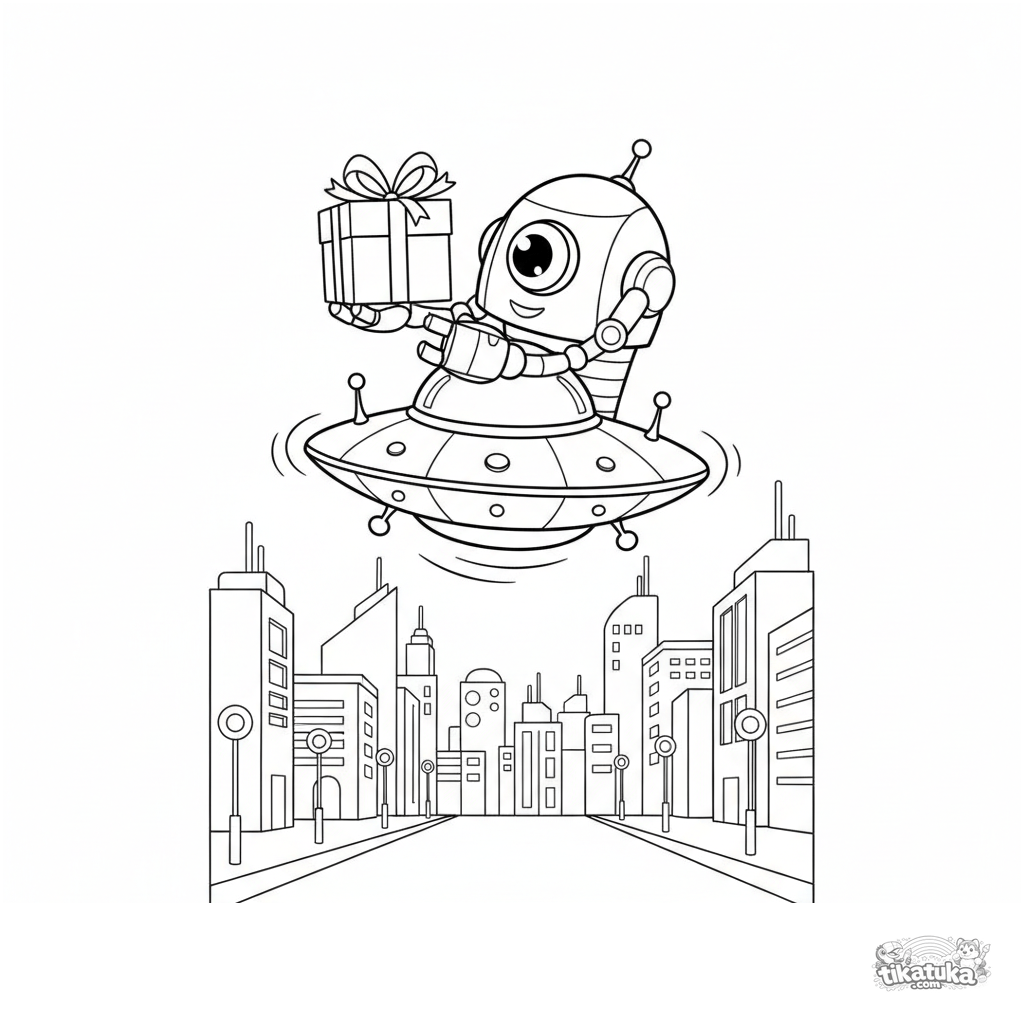 Coloring page for boys 4-6: a friendly delivery robot on a flying saucer carries a package over a futuristic city. Clear shapes, simple scene.