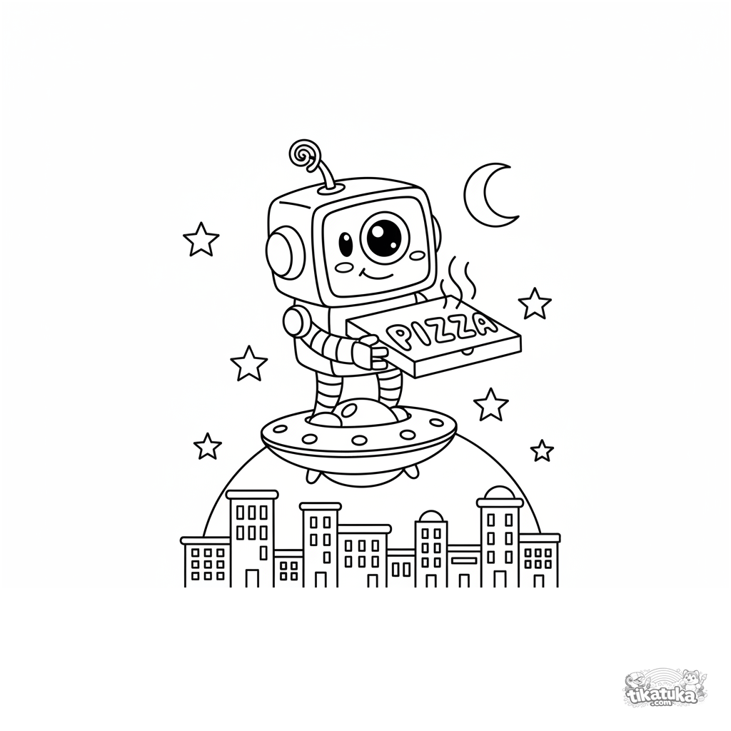 Coloring page for boys 4-6: a friendly delivery robot balances on a flying saucer, carrying a pizza box over a city skyline at dusk.