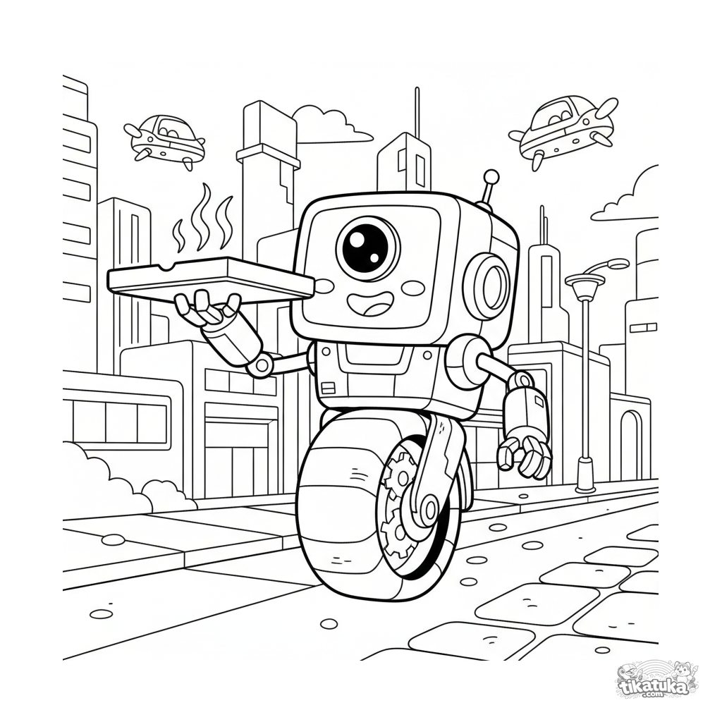 Coloring page for boys: a friendly delivery robot on a monowheel carries pizza through a futuristic city. For kids aged 4-6. A fun and dynamic scene.