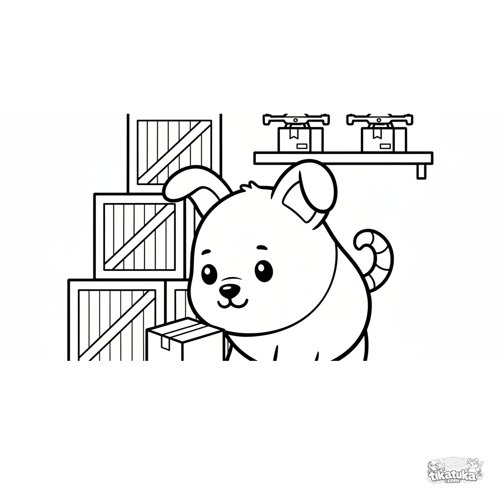 Toddler coloring page: a cute robot dog plays with a box in a large warehouse among shelves and drones. Simple shapes and wide margins for easy coloring.