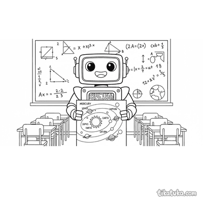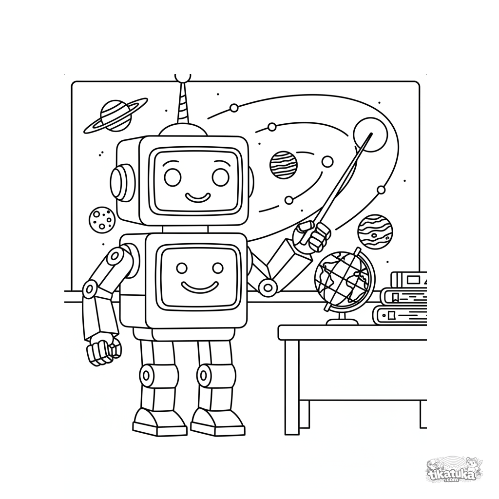 Coloring page for kids 4-6: a friendly robot teacher explains the solar system by a classroom blackboard, surrounded by textbooks and a globe.