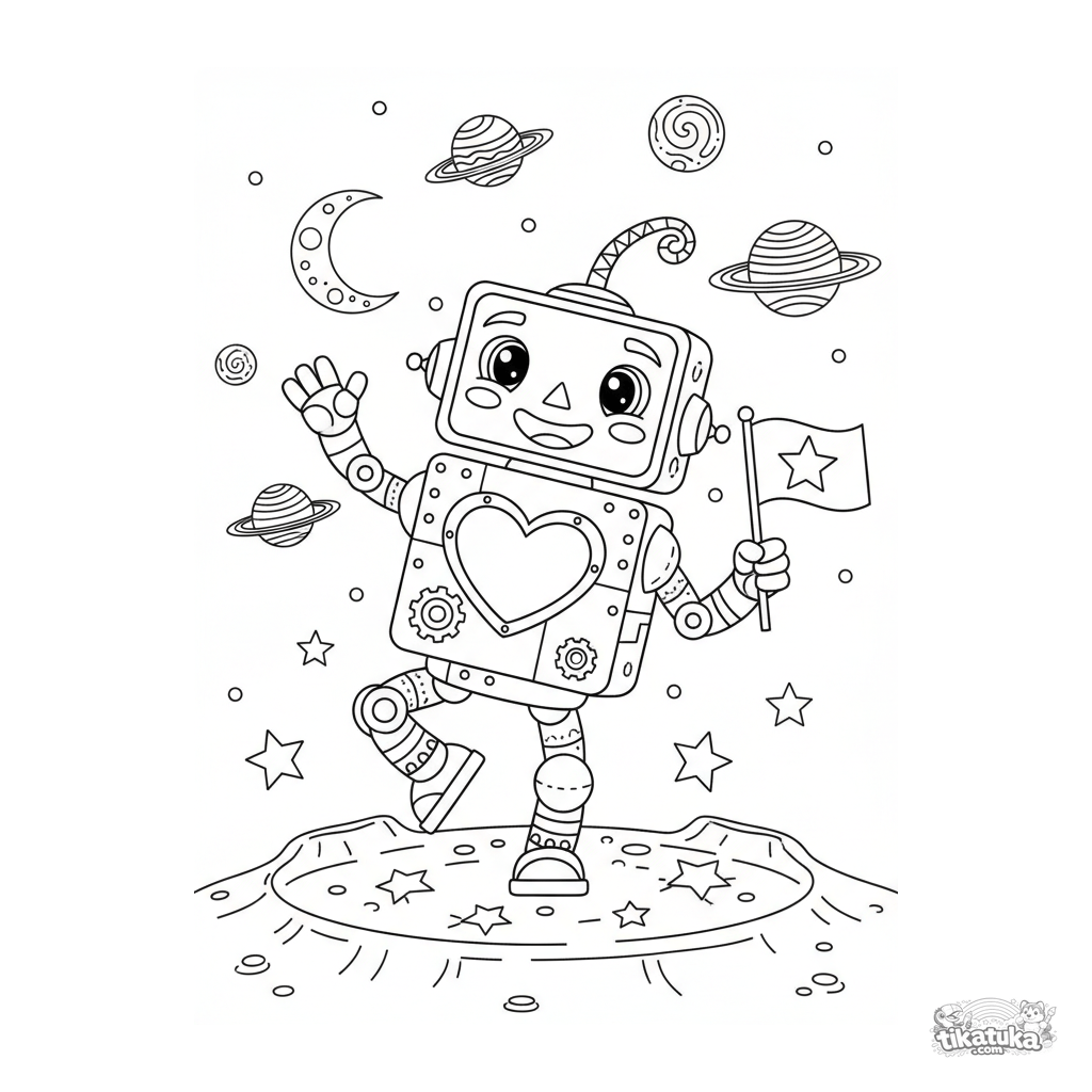 Coloring page for older kids 7-12: a friendly robot with a heart panel balances in a moon crater. A detailed scene with planets and rocks for engaging coloring.