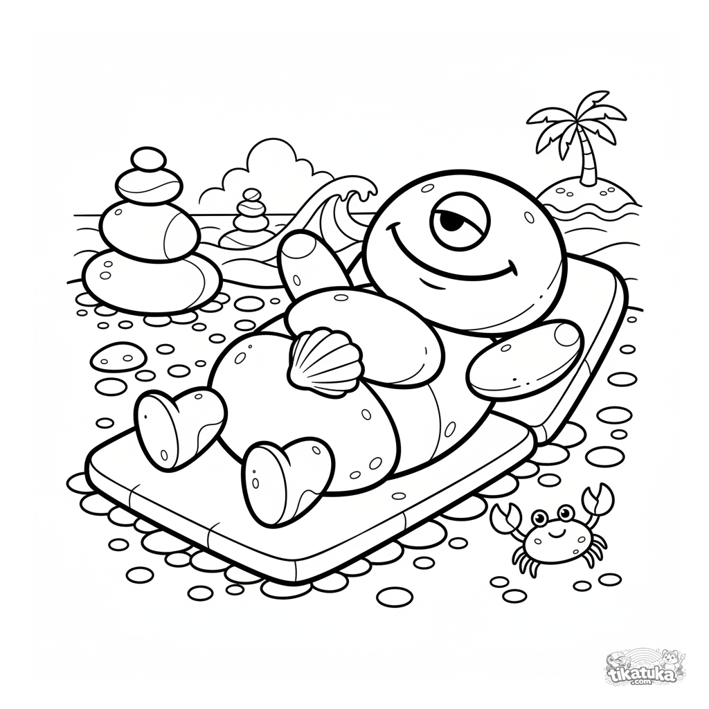 Coloring page of a friendly rock monster sunbathing on a pebble beach. For kids aged 3-6. A cute and peaceful scene with a funny, non-scary character.
