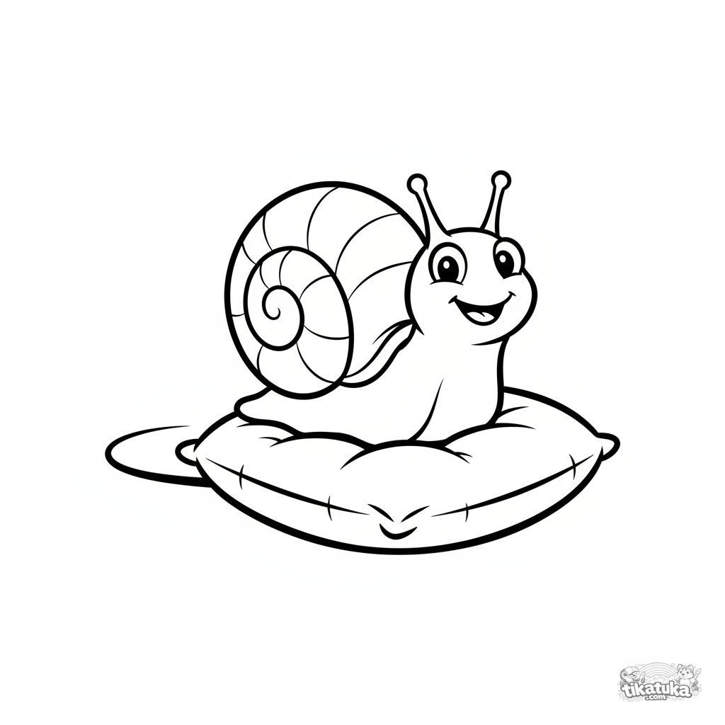 Simple coloring page for ages 2-3: a smiling snail with a shell house crawling on a soft cushion. Very few inner lines, large form.