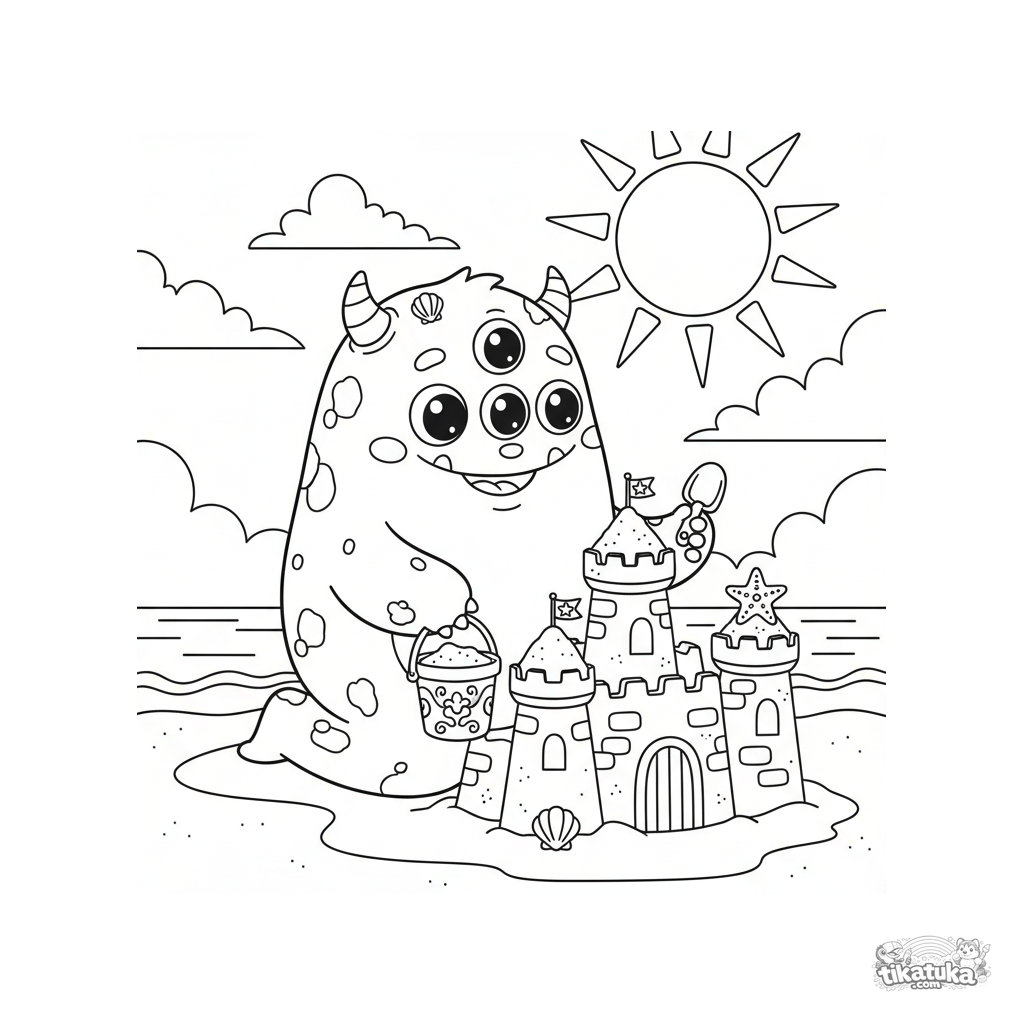 Fun coloring page for kids 4-6: a friendly three-eyed monster builds a sandcastle on the beach. A bright, positive scene with clear details.