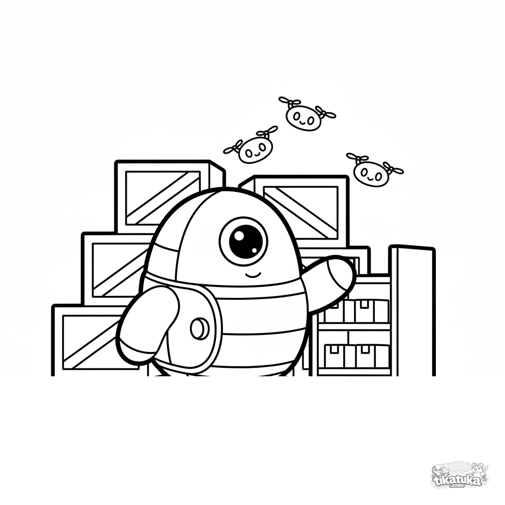 Toddler coloring page for ages 2-3: a friendly round robot sorting boxes in a warehouse among shelves and flying drones. Simple shapes, wide margins.