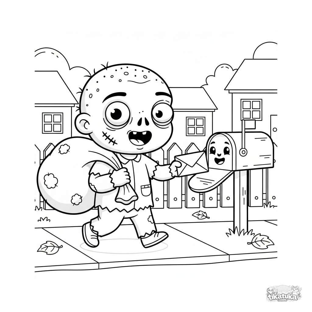 Coloring page for boys 4-6. A silly, friendly zombie mailman delivering letters on a street. A fun and non-scary monster scene to color.