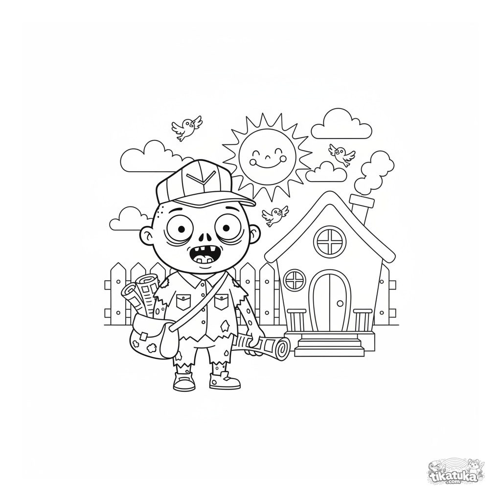 Funny coloring page for boys aged 4-6 featuring a friendly zombie mail carrier. Not scary, but a cute and silly scene with a newspaper at a house.