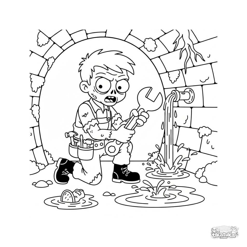 Coloring page for kids 4-6: a friendly zombie plumber fixing a pipe in a sewer tunnel. A fun, non-scary scene for creativity.