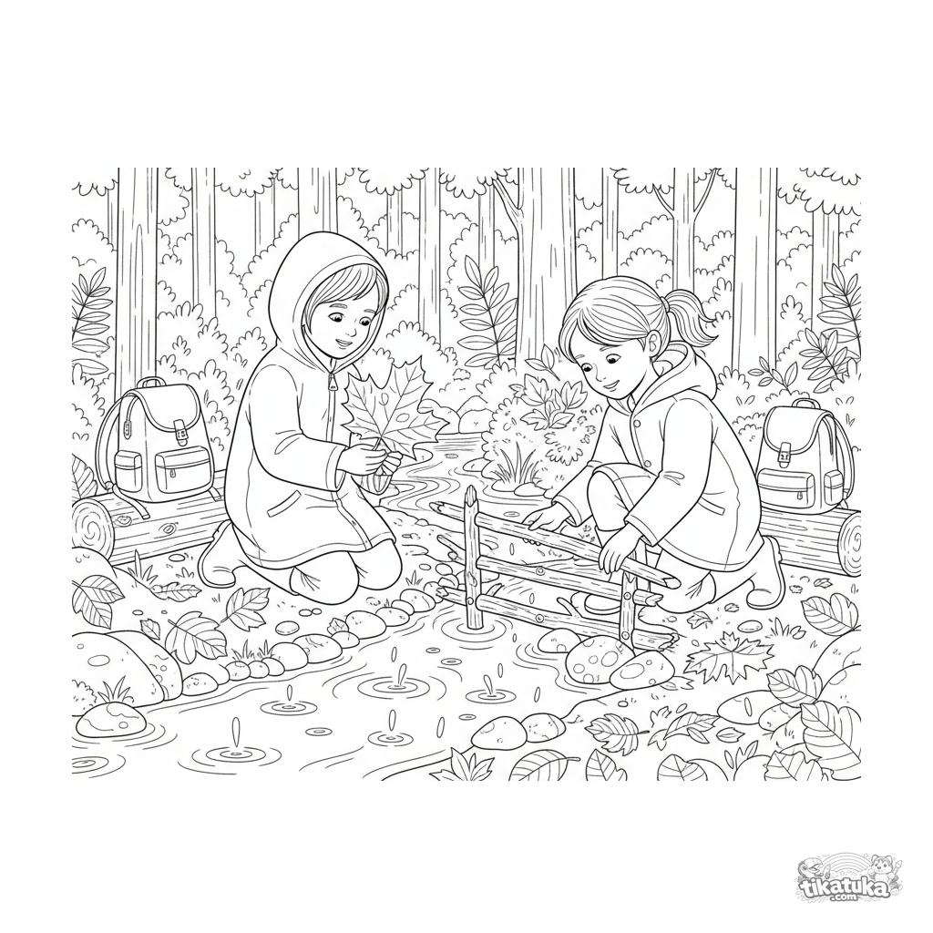 Detailed coloring page for kids 10-12: two friends in raincoats build a leaf and stick dam in a forest stream under autumn rain.