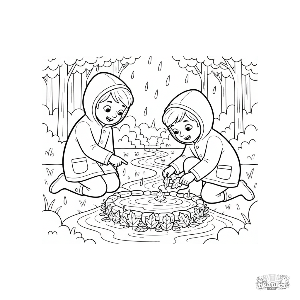 Tweens coloring page (ages 7-9): two friends in raincoats build a leaf dam in an autumn stream during a rain shower. Action scene with moderate detail and expressive poses.