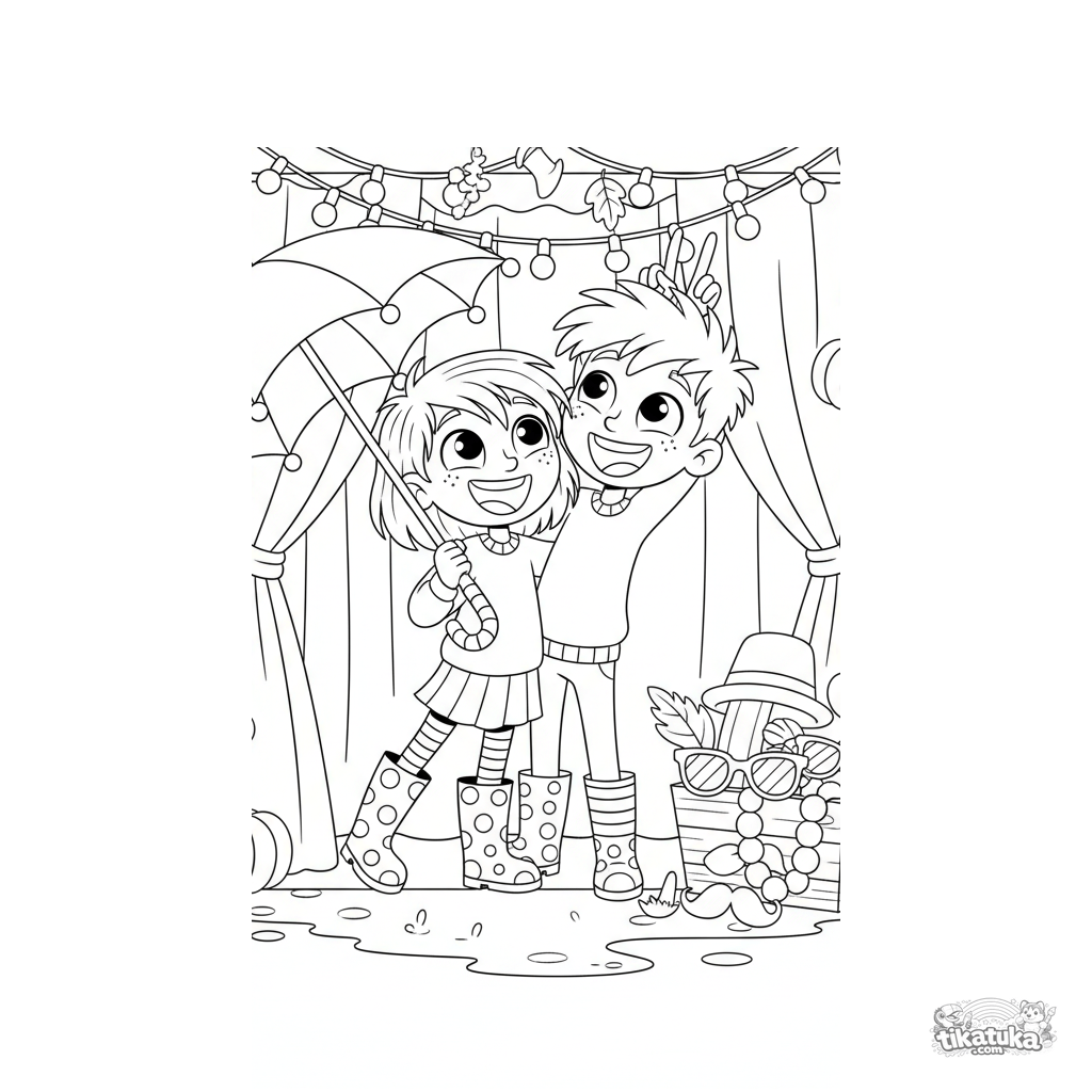 Coloring page for tweens 7-9 years: two friends having fun in a photo booth at a rainy autumn fair. Expressive poses, moderate background, clear outlines.