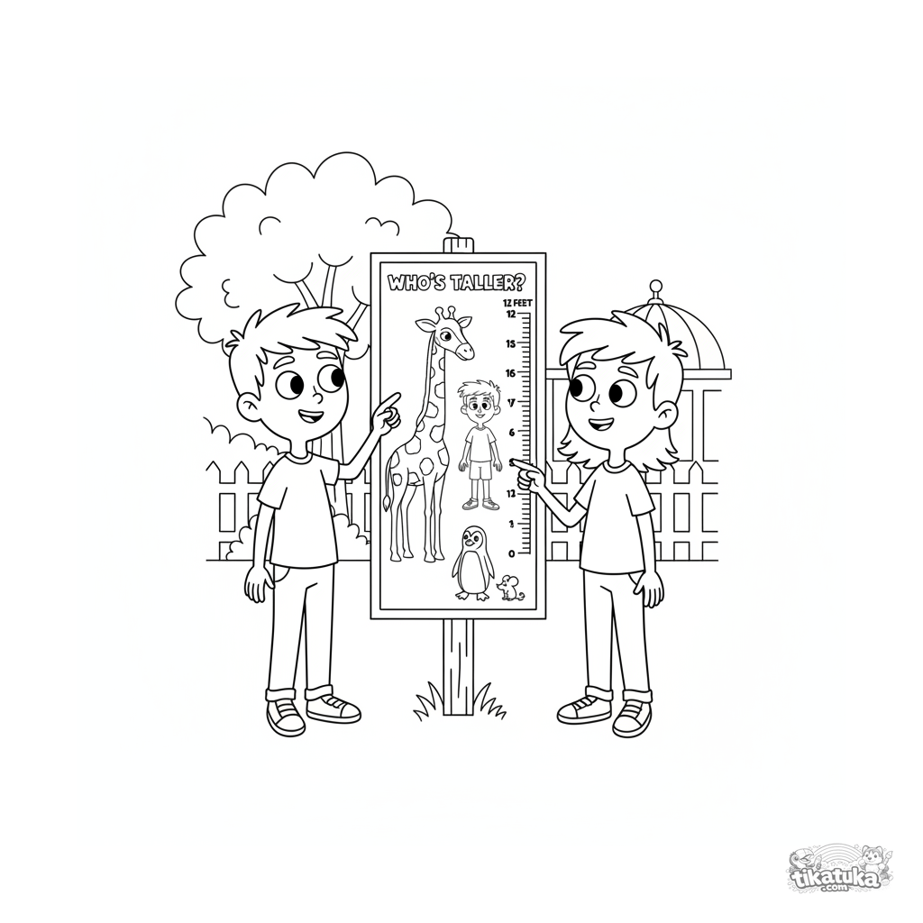 Coloring page for kids 7-9: friends study a chart comparing animal sizes at the zoo. A dynamic educational scene about height and measurement, great for a group.