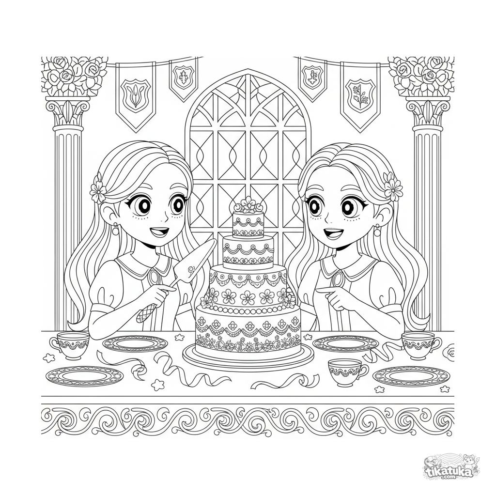 Detailed coloring page for older kids 10-12: two friends sharing a festive cake at a table in a decorated hall. A scene of friendship and fun with details.
