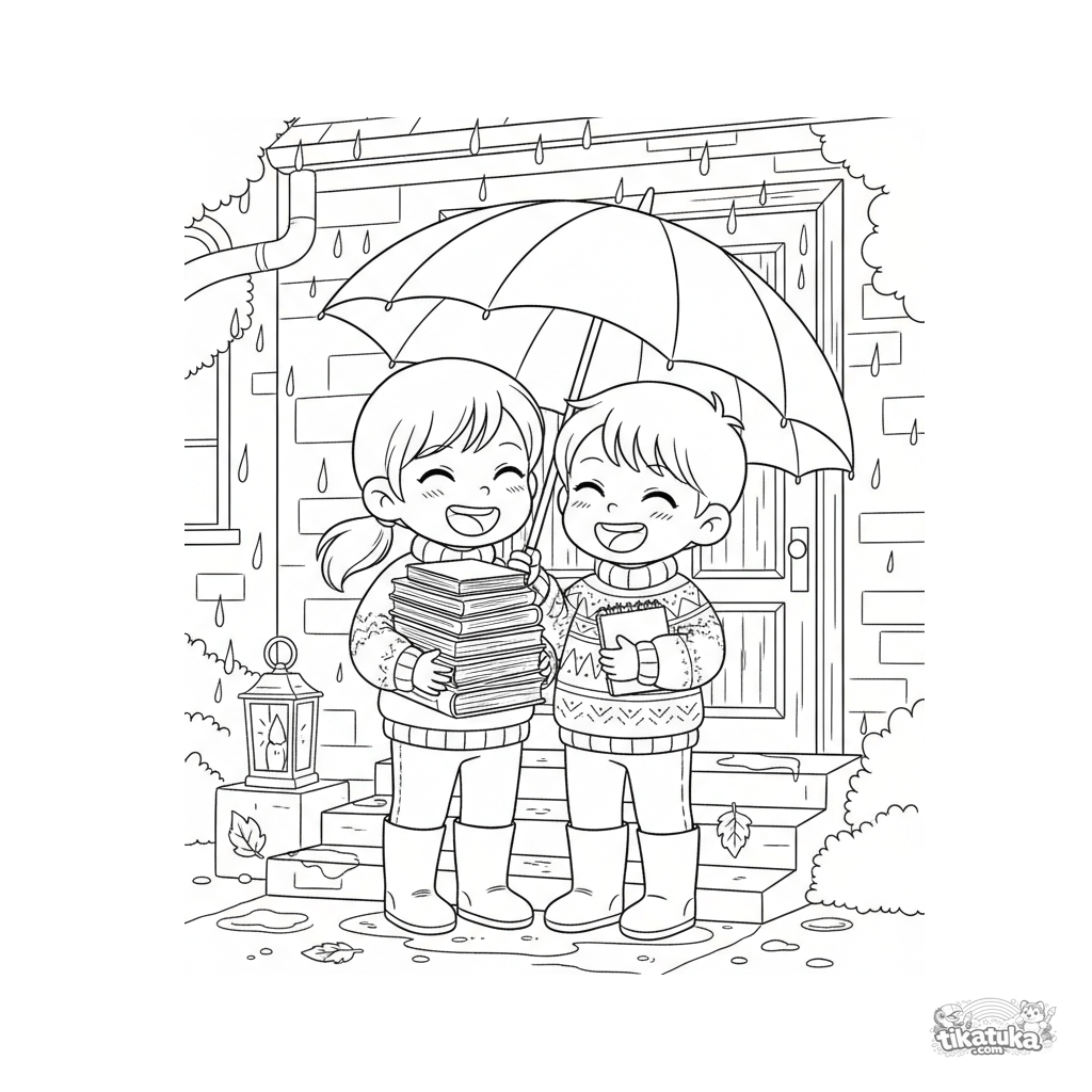Coloring page for tweens 7-9 years: two friends under a large striped umbrella on library steps in the autumn rain. They have books, sweaters, and rubber boots.