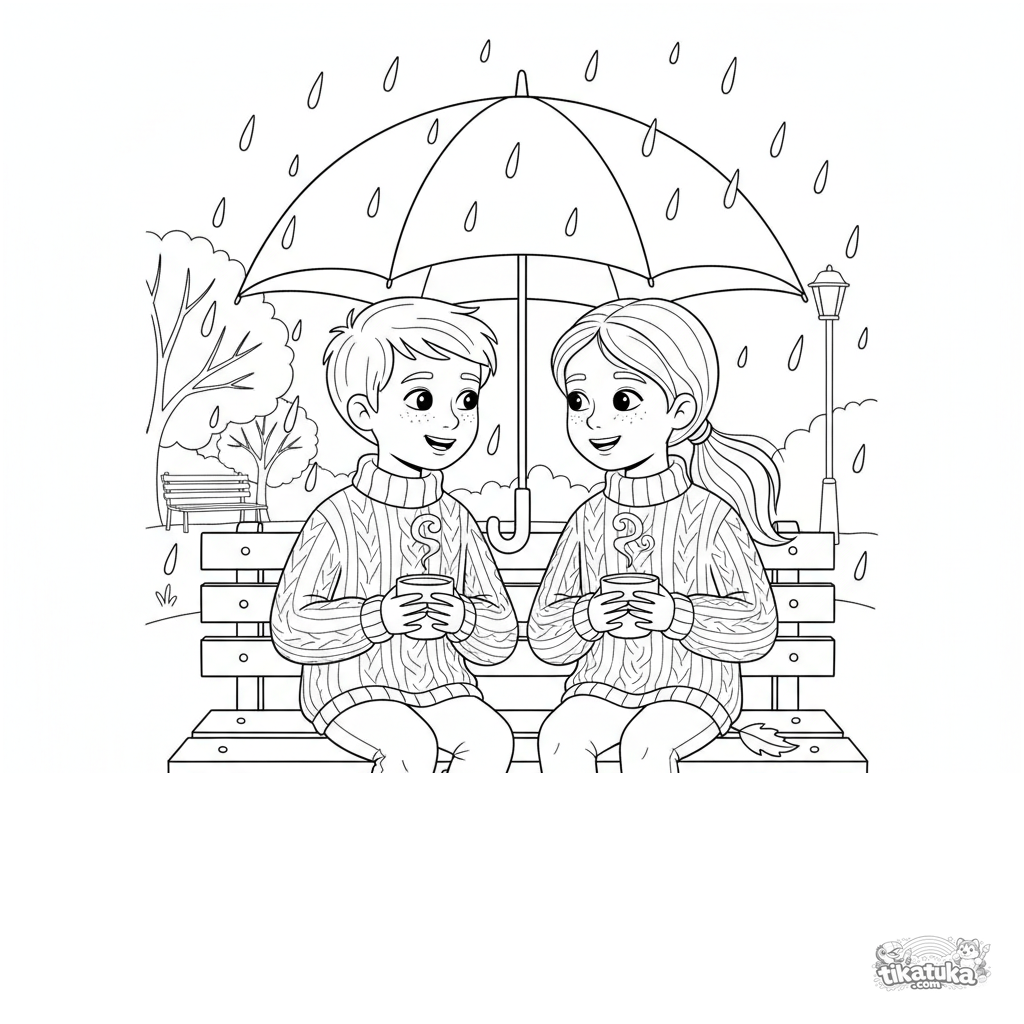 Coloring page for tweens 7-9: two friends in sweaters and boots sit on a bench sharing an umbrella, drinking hot drinks in autumn rain.