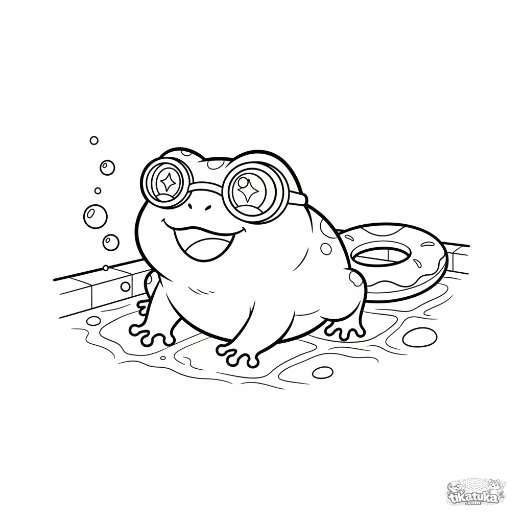 Coloring page of a frog diver with goggles on the pool bottom. For tweens 7-9 years old. Exploring the underwater world with an inflatable ring.