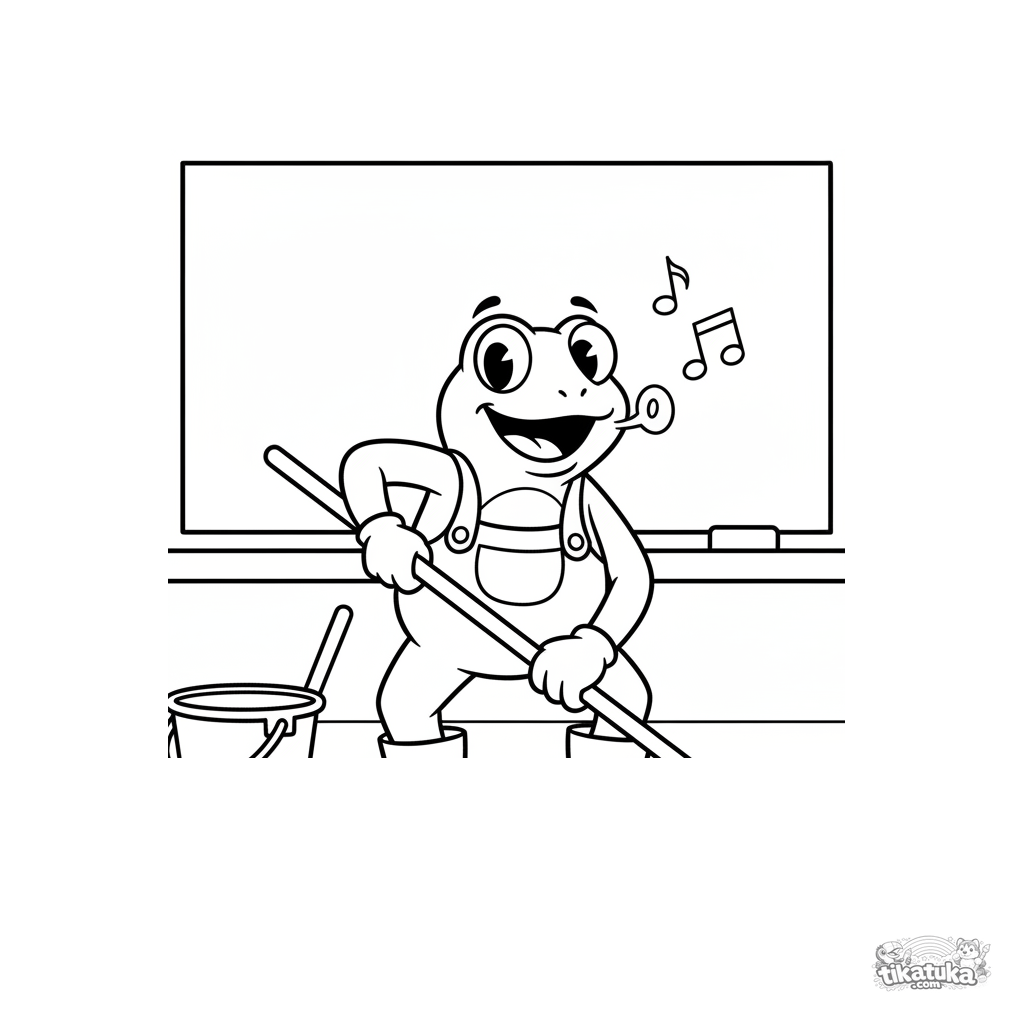Coloring page for toddlers 2-3: a cheerful frog janitor in overalls mops the floor under the school blackboard in a classroom, simple large shapes.