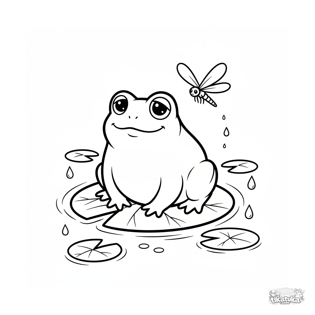 Simple coloring page for toddlers 2-3: a cute frog sits on a lily pad by a calm stream, watching a dragonfly. Large, clear shapes for easy coloring.