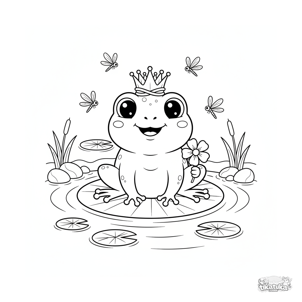 Coloring page for kids 4-6: a cheerful frog wearing a reed crown sits on a lily pad by a stream. Cute chibi style, dragonflies, a flower.