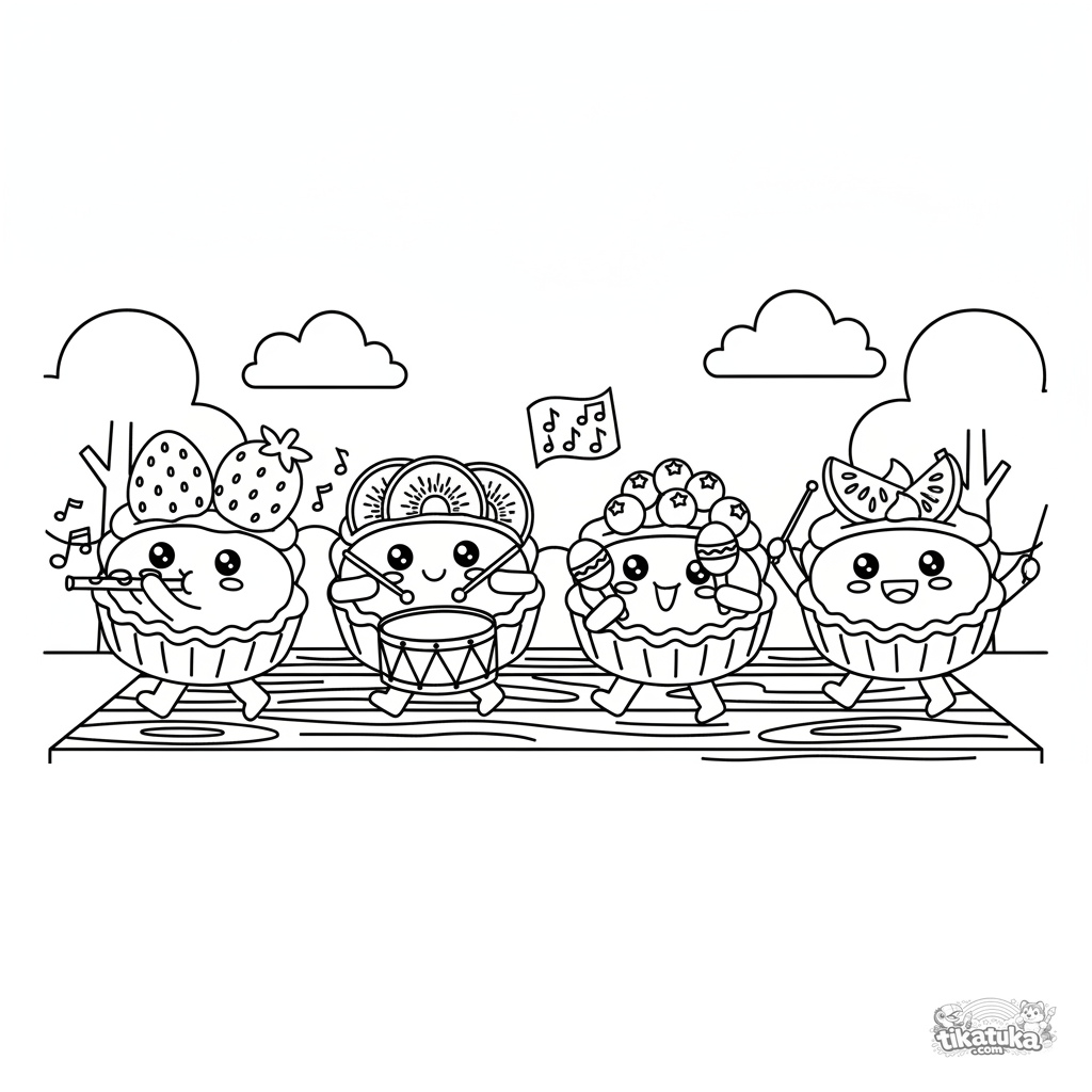 Coloring page of a fruit tart marching band on a picnic. Happy desserts playing instruments and marching. For kids 4-6 years old.