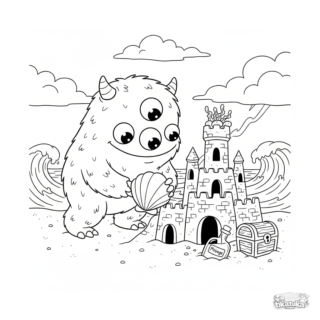 Coloring page of a friendly furry monster. For kids aged 3-6. The three-eyed monster builds a sandcastle on a deserted, stormy beach.