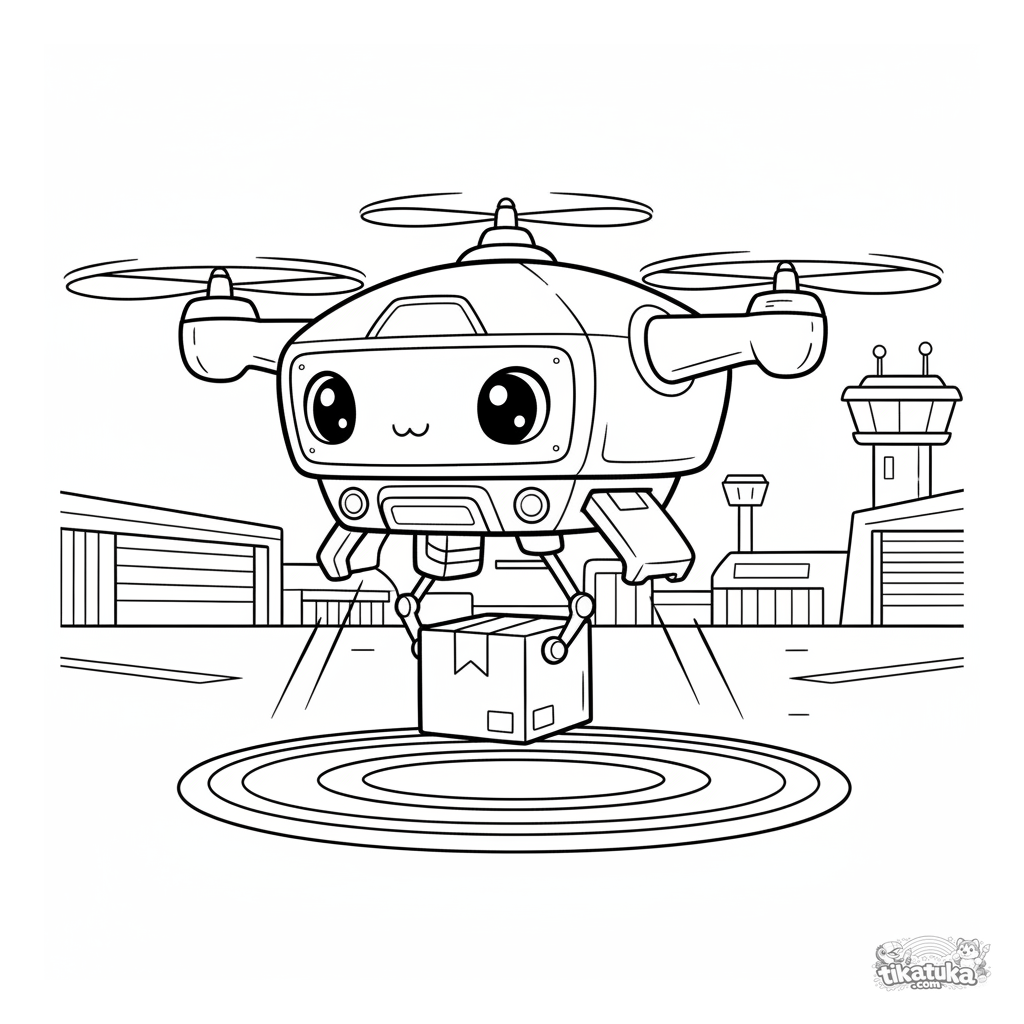 Coloring page for boys: a futuristic delivery drone hovers over an airfield to lower a package. Clear geometric shapes and interesting details.
