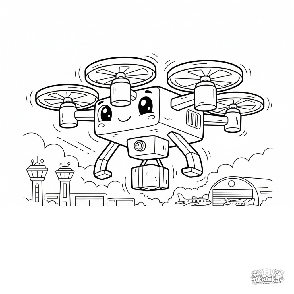 Coloring page for boys: a futuristic delivery drone landing at an airfield. Age 4-6. Clear outlines, interesting tech subject.