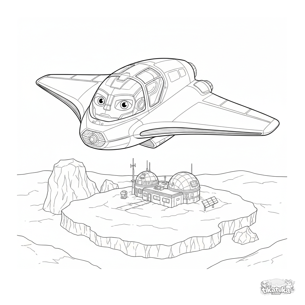 Complex coloring page of a futuristic electric aircraft hovering over an Arctic research station. For ages 10-12. Technical blueprint style, icy landscape.