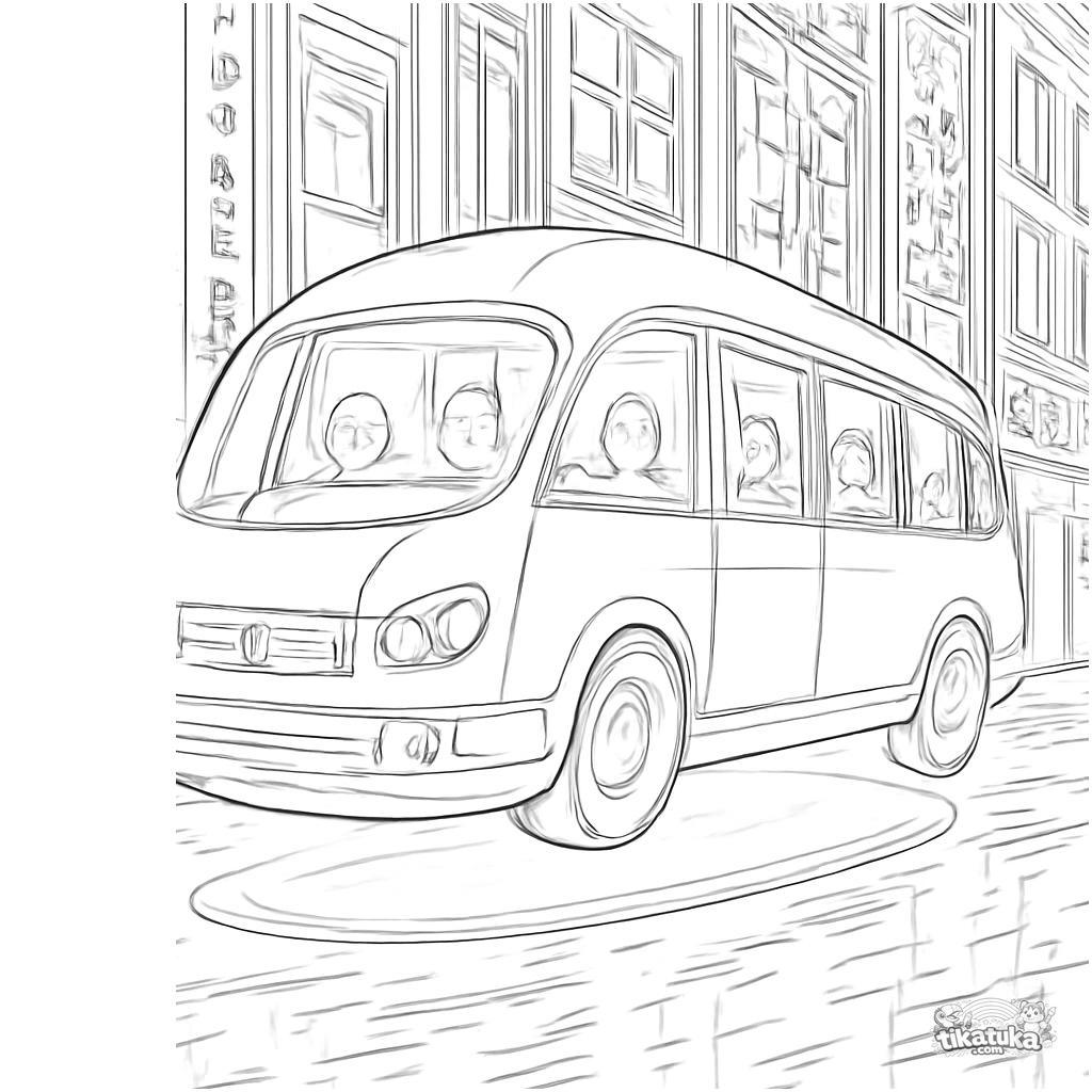 Coloring page of a futuristic hover bus in a neon city. For kids 8-12 years old. Detailed image of the full vehicle with passengers and night lights.