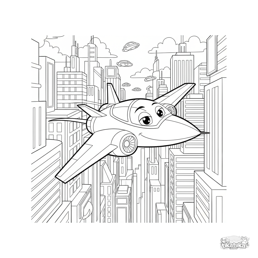 Coloring page of a futuristic jet banking through skyscrapers in a neon city. For tweens aged 7-9. Dynamic composition with clear outlines.