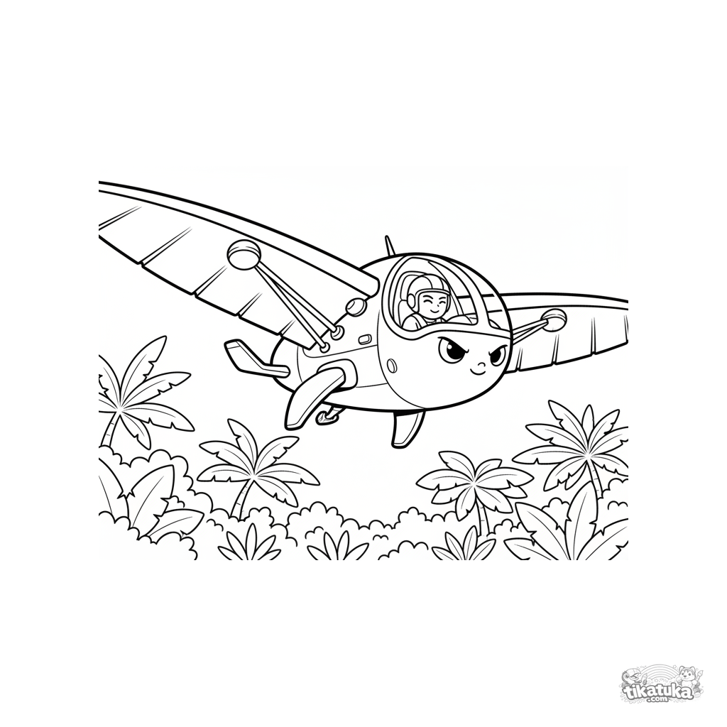Coloring page of a futuristic ornithopter with mechanical wings, flying over a jungle. Dynamic anime-inspired design. For tweens ages 7-9.