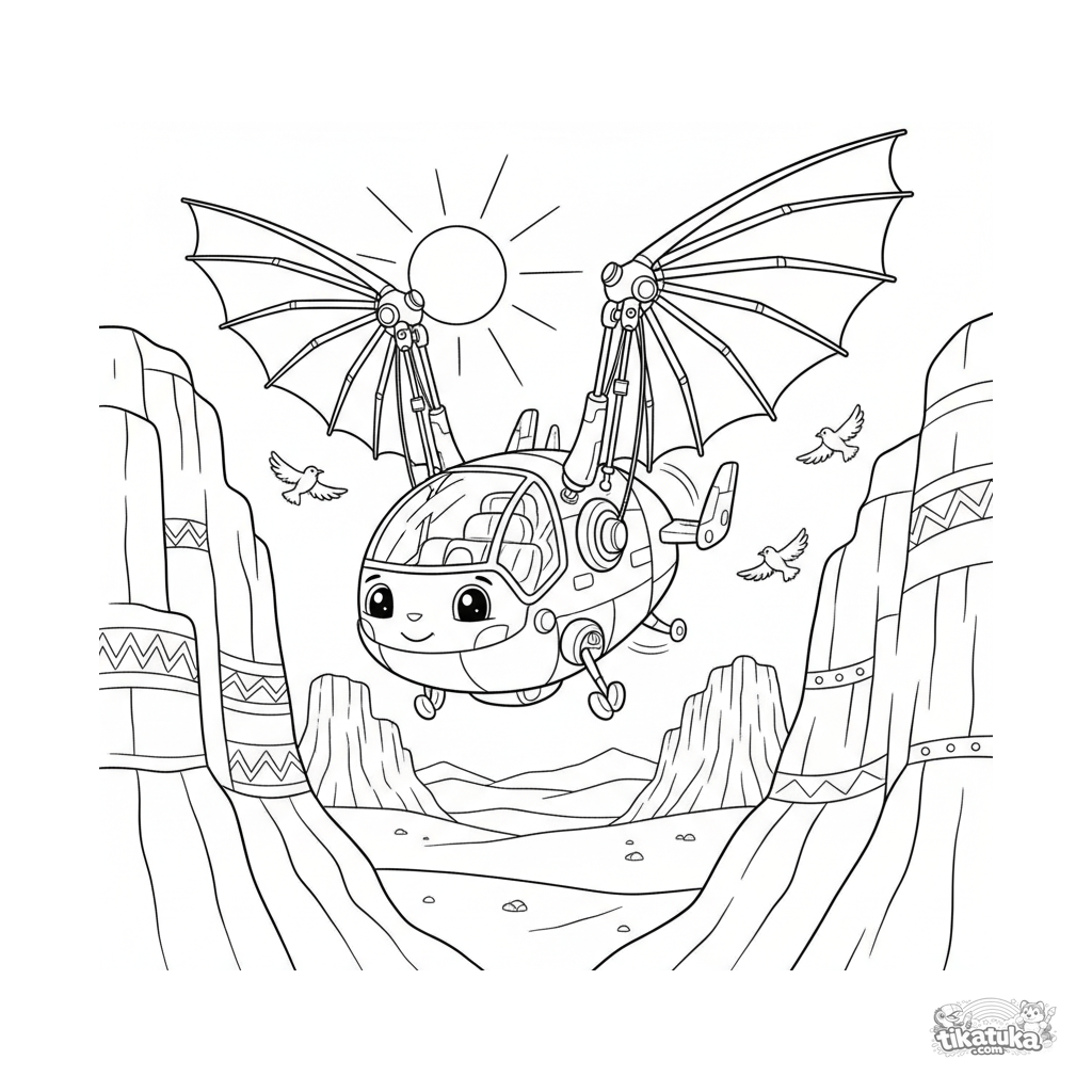 Coloring page for older kids 10-12: a futuristic ornithopter with flapping wings soars over desert canyons. Intricate mechanical details, unusual design.