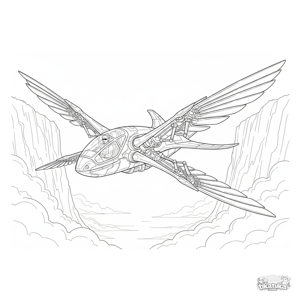 Complex coloring page in blueprint style: a futuristic ornithopter with flapping wings flies through fog between cliffs. For kids 10-12 years old.
