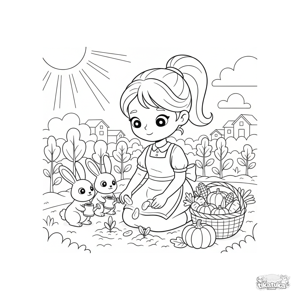 Coloring page for ages 4-6: a garden princess plants magic seeds in a vegetable patch, helped by curious rabbits with a watering can. A sweet scene in an enchanted garden.