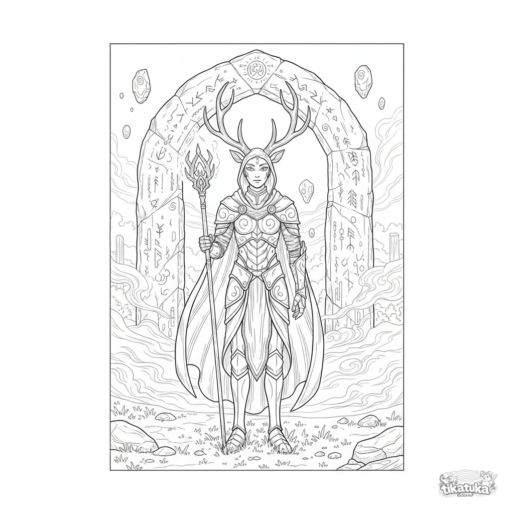 Detailed coloring page for older kids 10-12: a majestic, antlered gatekeeper stands guard before an ancient archway of floating stones covered in glowing runes.