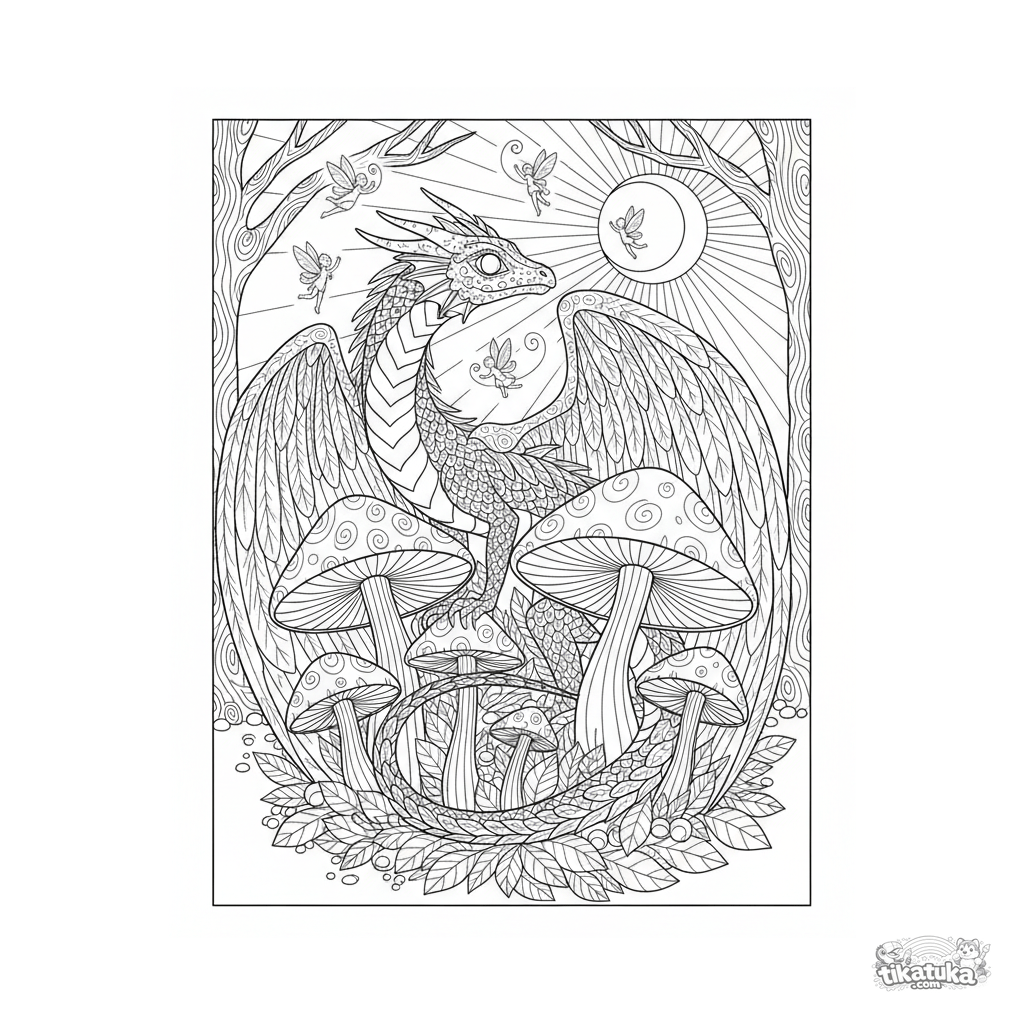 Intricate coloring page for older kids: a graceful forest dragon guards a magical ring of glowing mushrooms in a moonlit grove. Detailed linework and a fairy-tale atmosphere.