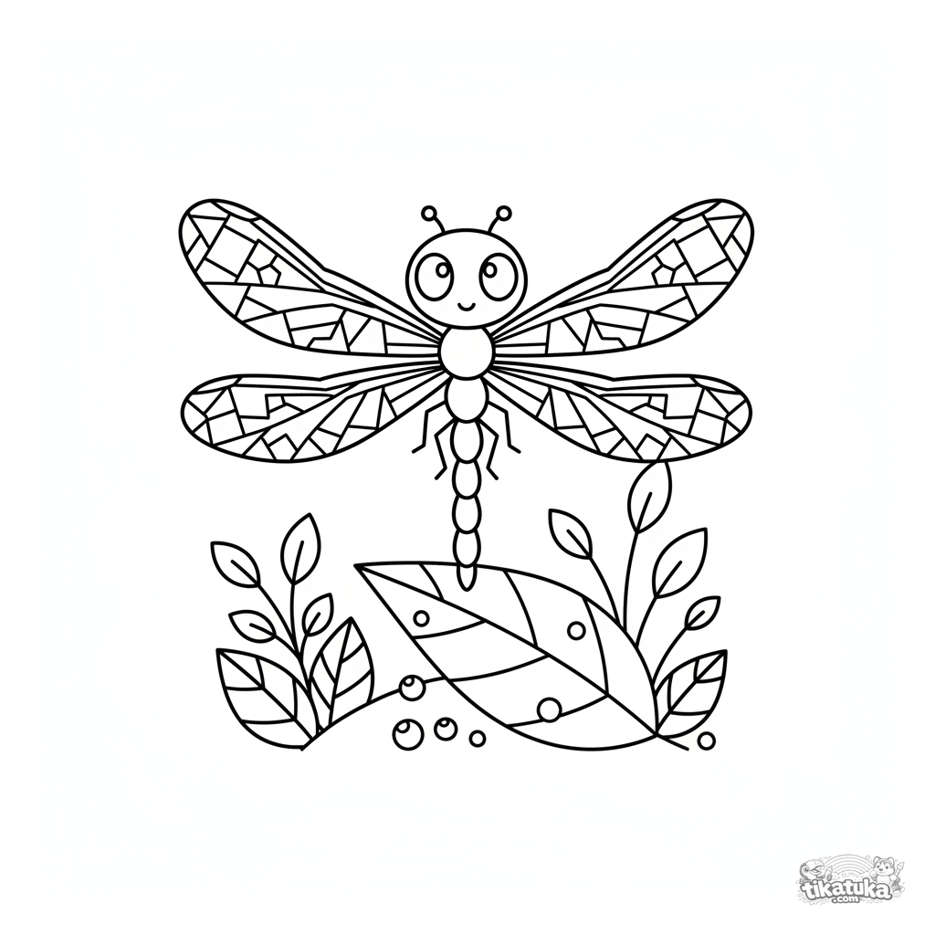 Coloring page for kids 4-6: a dragonfly with geometric wings perches on the tip of a leaf with dewdrops. A minimalist and stylish design.