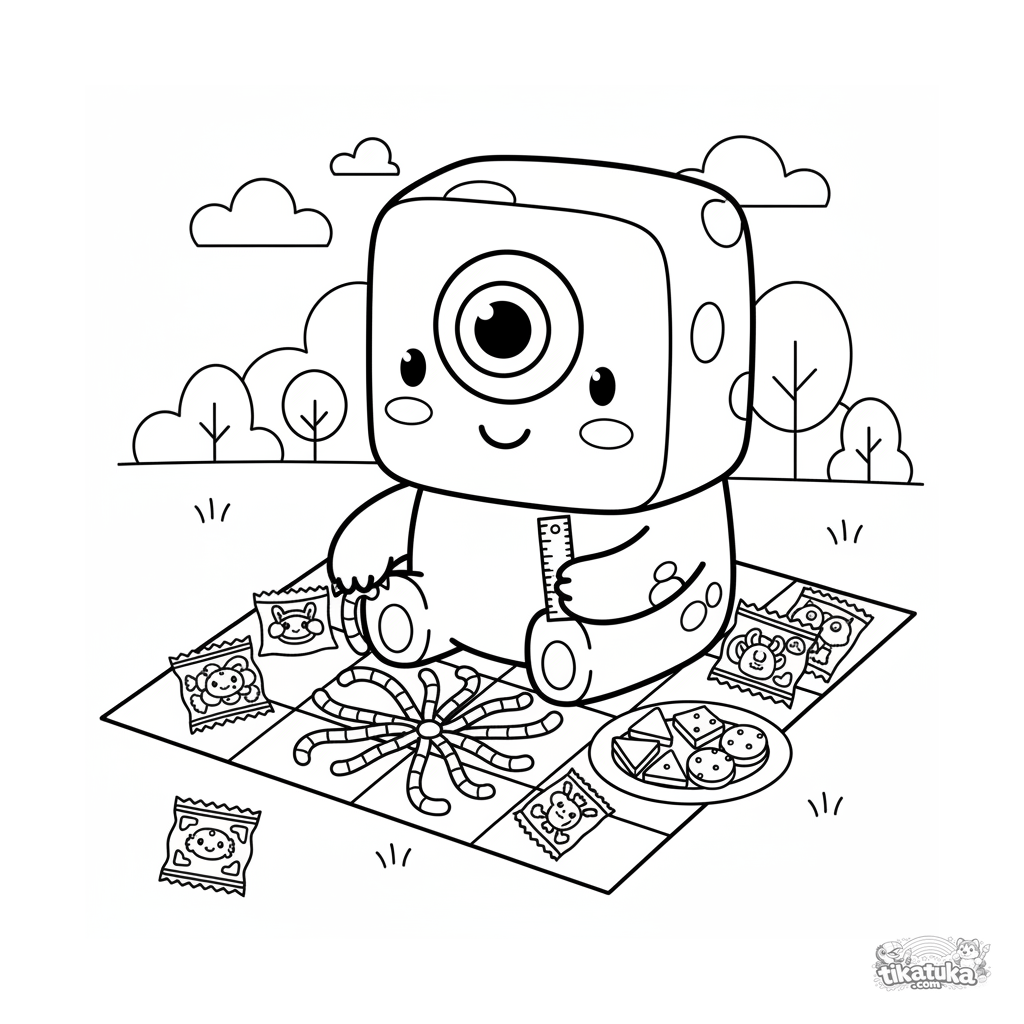 Coloring page for tweens 7-9: a geometric monster creating a pattern with gummy worms at a picnic. Moderate detail, interesting composition.