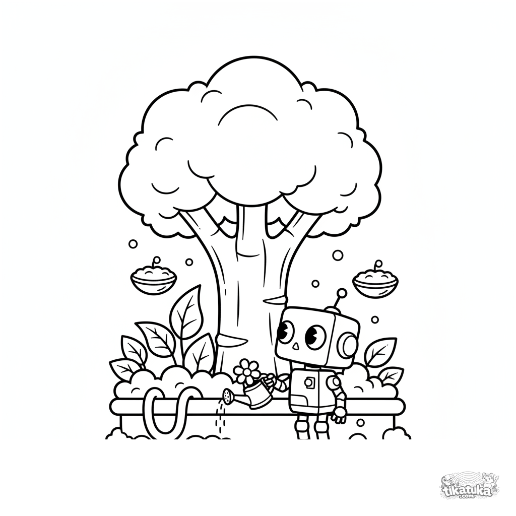 Coloring page of a giant broccoli and a tiny gardener robot. For tweens 7-9. Scene from a futuristic hydroponic garden.