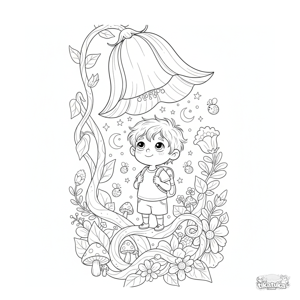 Coloring page for kids 7-9: a child inside a giant magical moonflower in a night garden. A fantasy scene for creative coloring.