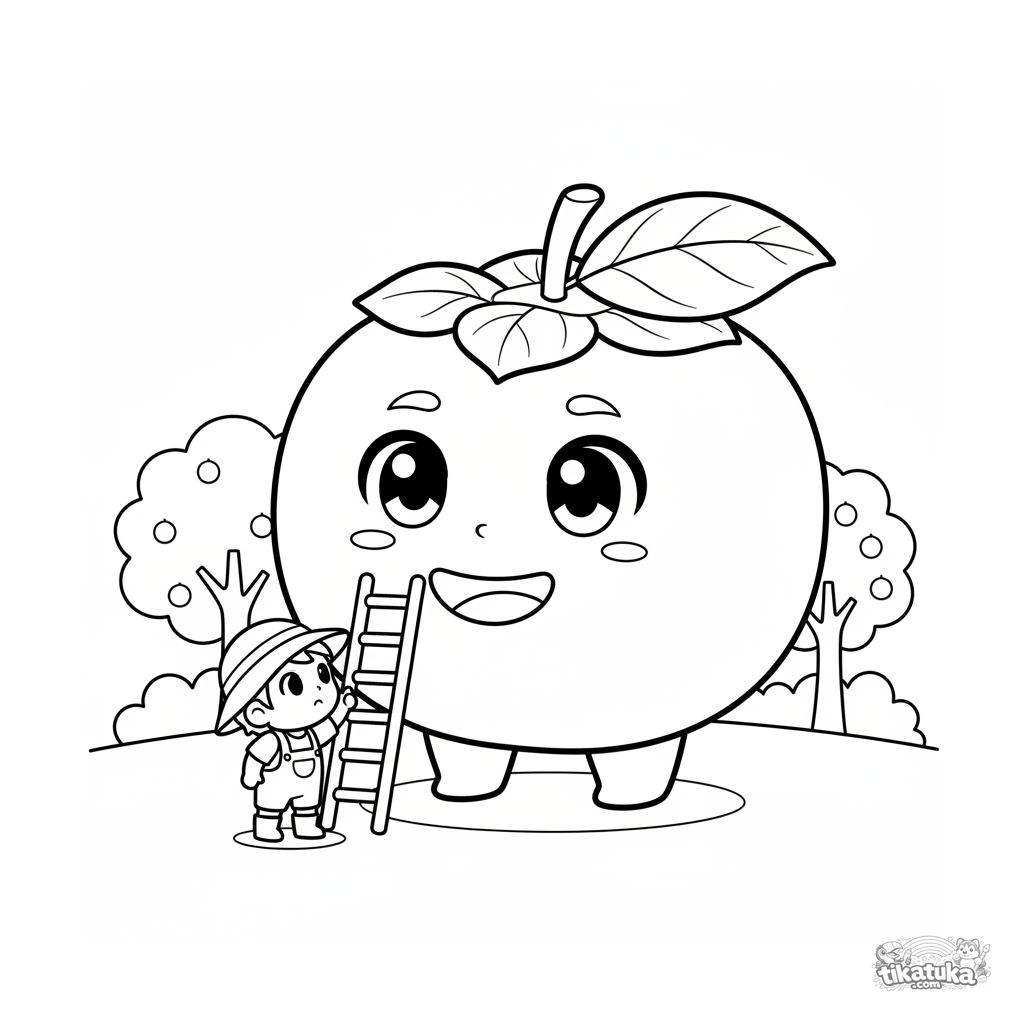 Coloring page for kids 4-6: a cheerful giant persimmon and a tiny gardener with a ladder in an orchard. Chibi style, simple shapes.