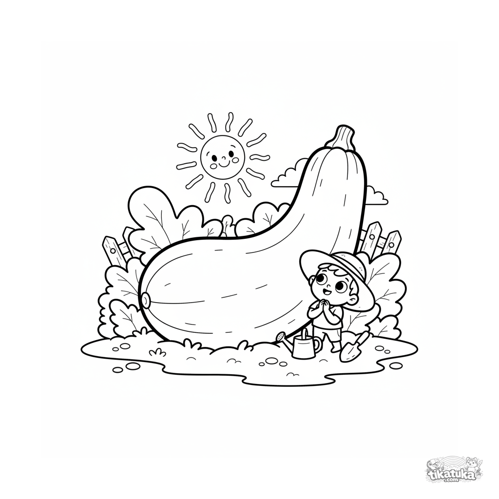 Coloring page for ages 7-9: a giant zucchini in a garden bed and an awestruck tiny gardener. Funny scene with size contrast in a storybook style.