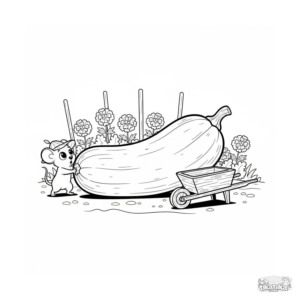 Coloring page for ages 7-9: a giant zucchini and a gardener mouse with a wheelbarrow. Garden scene in a gentle storybook style.