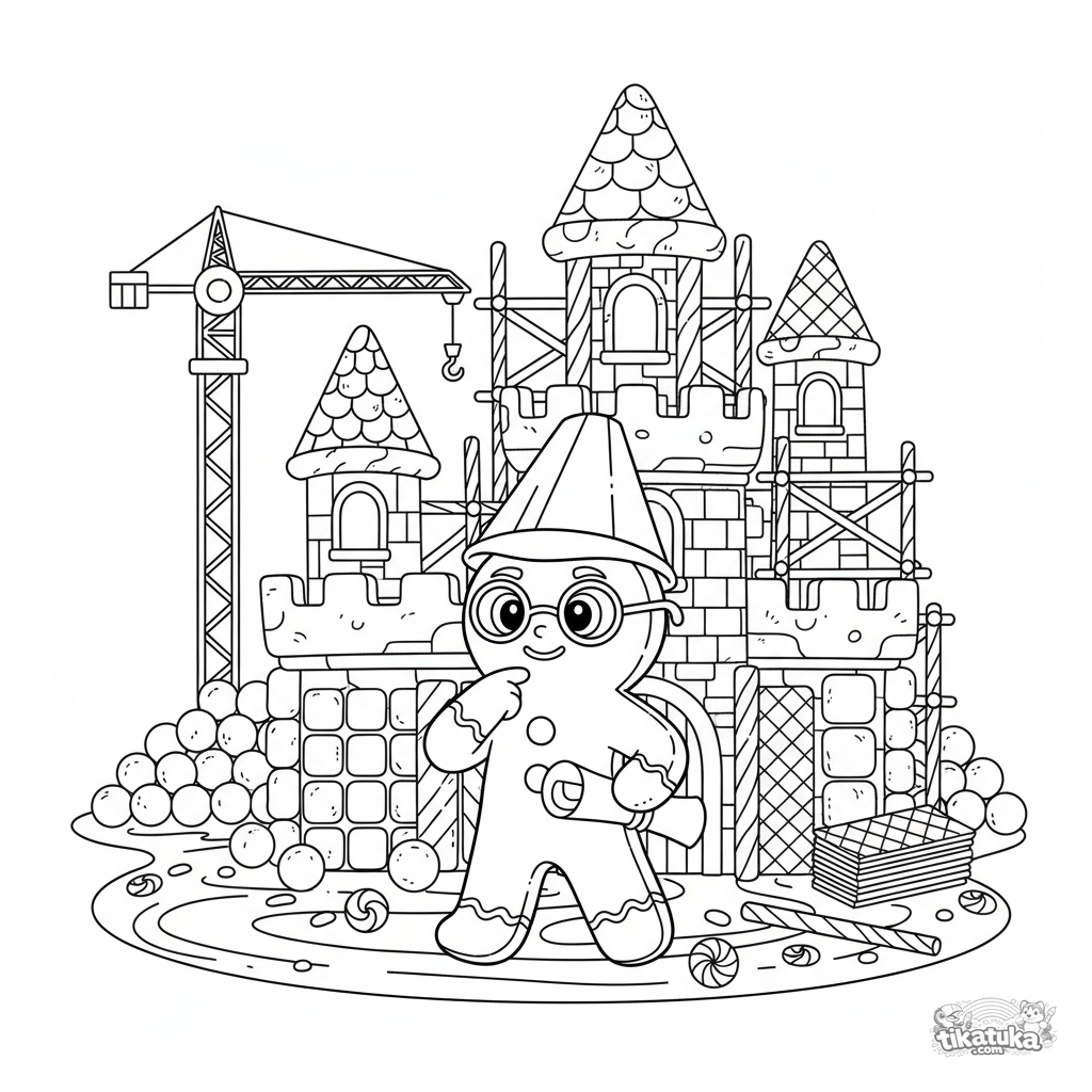 Fairy tale coloring page for kids 5-7. A gingerbread man architect surveys a candy castle construction site. A fun and detailed scene.