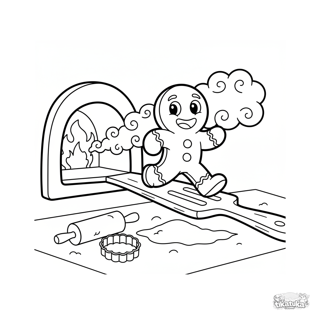 Coloring page from the Gingerbread Man fairy tale. For toddlers aged 2-5. The gingerbread man with candy eyes is escaping from the oven on a spatula.