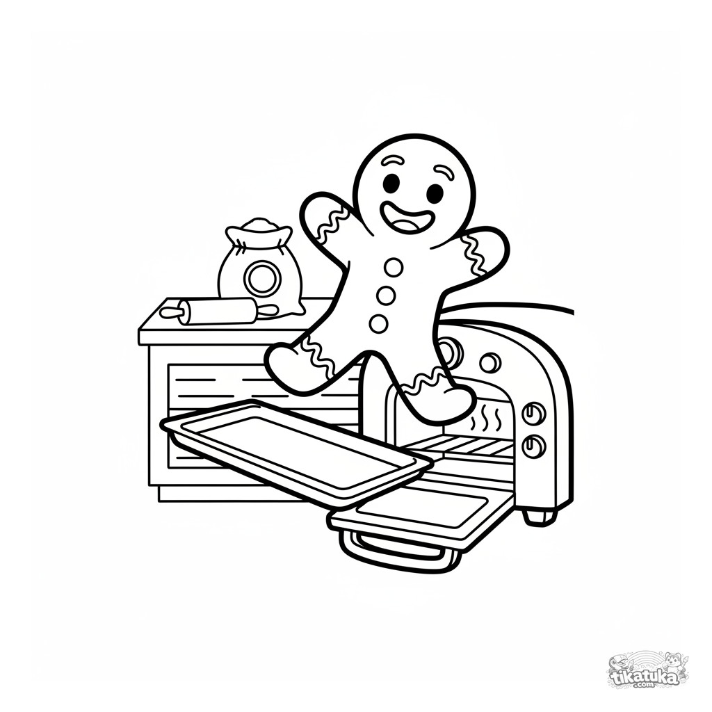 Easy coloring page from the Gingerbread Man fairy tale. For toddlers aged 2-5. The cheerful cookie escapes from a baking sheet, with a kitchen oven and rolling pin in the background.