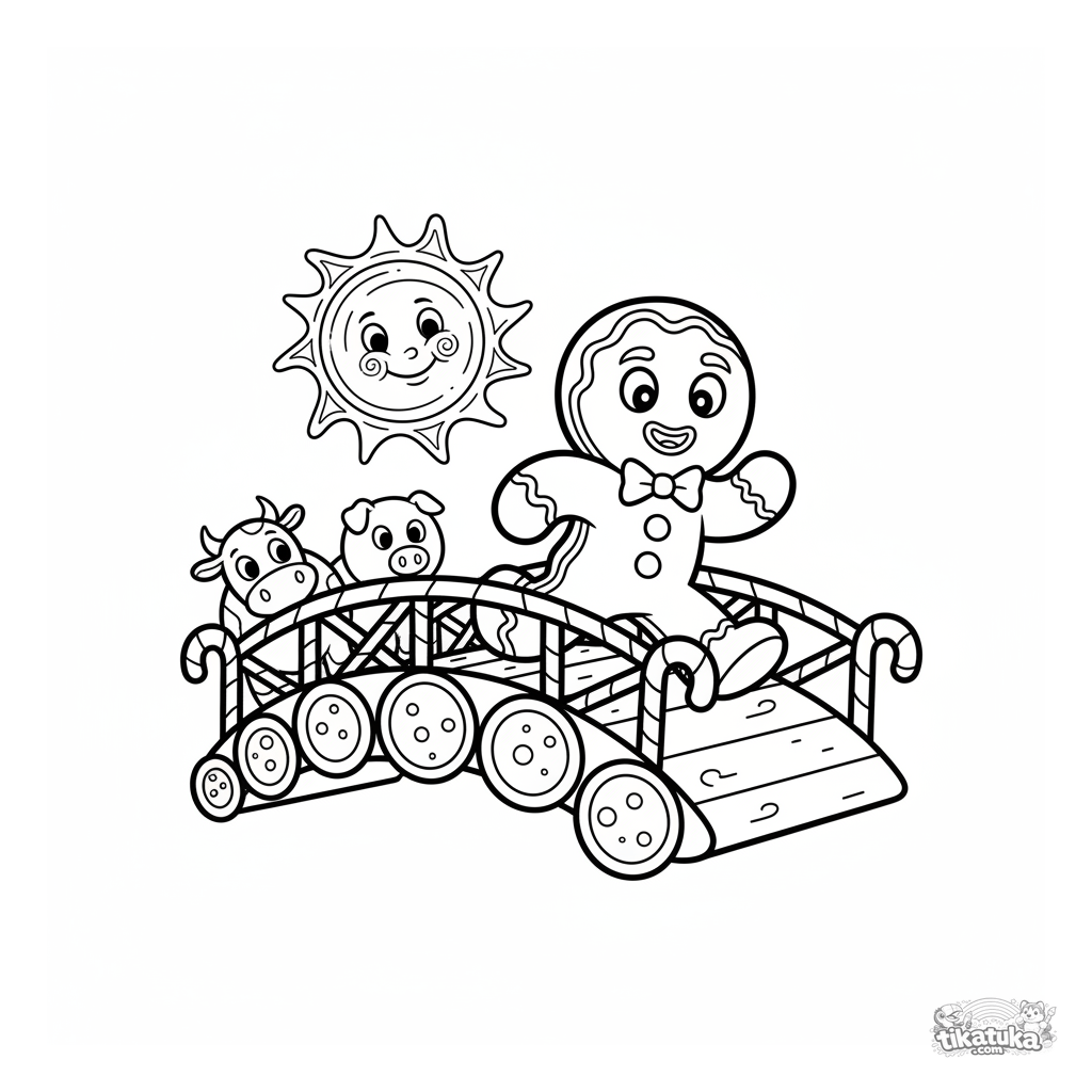 Toddler coloring page from the fairy tale: The Gingerbread Man running across a cookie bridge. Very simple, large shapes, minimal background, wide margins for coloring by ages 2-3.