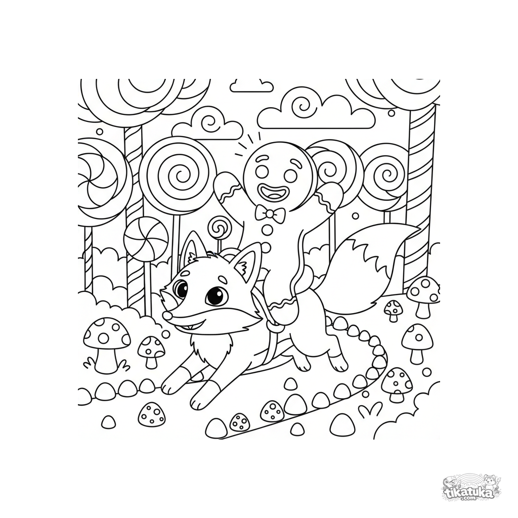 Fairy tale coloring page: a cheerful Gingerbread Man rides a fox through a forest of candy canes and lollipop trees. For kids aged 5-8. Scene includes candy details.